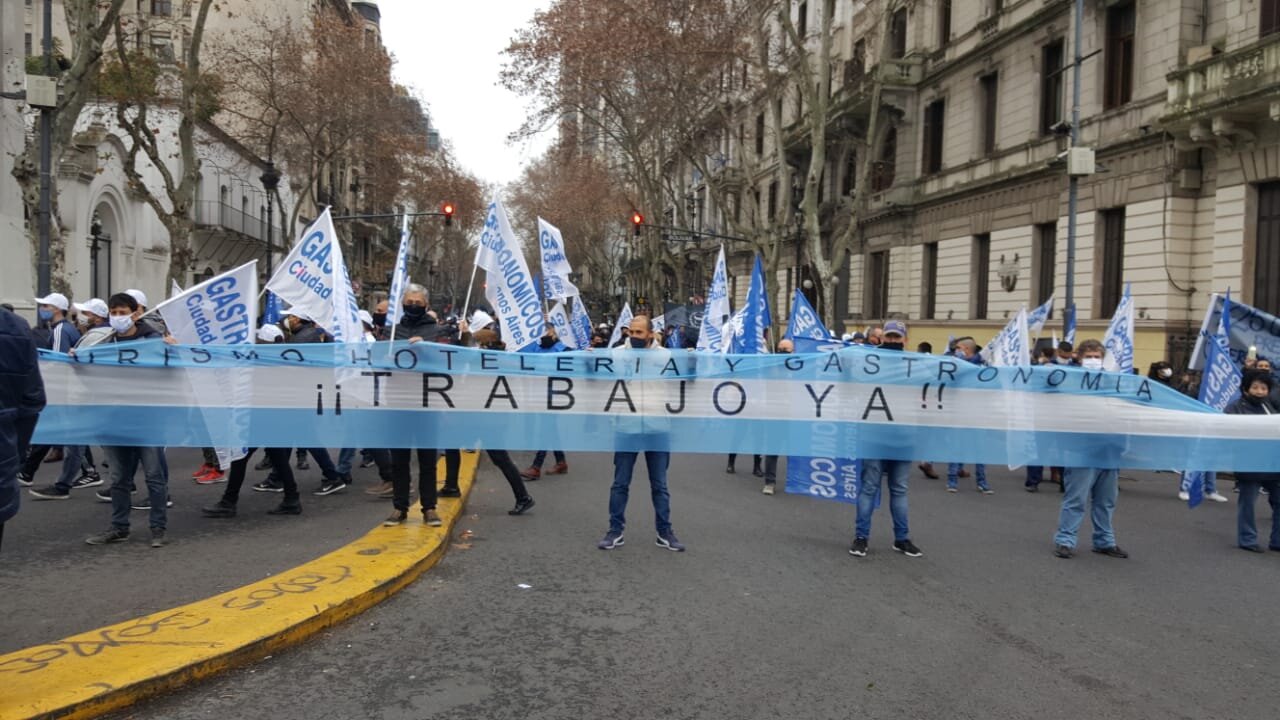 UTHGRA Avellaneda – Lomas de Zamora, junto a su secretaria general Laura Sasprizza, comisión ejecutiva, empleados y trabajadores de diferentes establecimientos, se hicieron presentes hoy en la marcha hacia Plaza de Mayo encabezada por nuestro secretario general Luis Barrionuevo, en reclamo de la reapertura de locales gastronómicos y hoteleros con protocolos de seguridad y el tratado de una Ley gastronómica de emergencia.